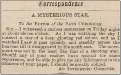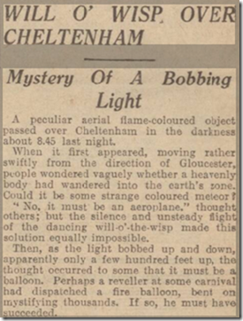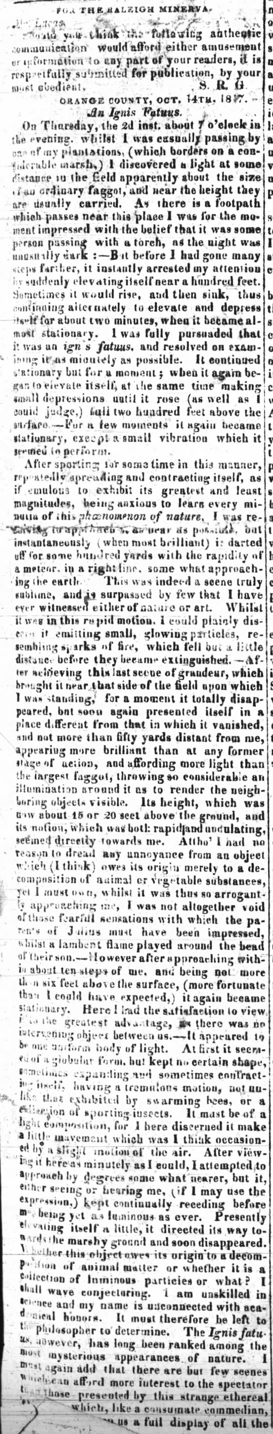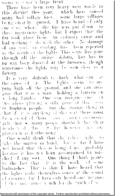 "Some few days ago we witnessed here what we have never seen before -- certain lights, eight in number, extending over, I should say, a distance of 8 miles; all seemed to keep their own ground, although moving in horizontal, perpendicular, and zig-zag directions. Sometimes they were of a light blue colour, then like the bright light of a carriage lamp, then almost like an electric light, and going out altogether, in a few minutes would appear again dimly, and come up as before. One of my keepers, who is nearly 70 years of age, has not, nor has any one else in this vicinity, seen the same before. Can any one of your numerous readers inform me whether they are will-o'-the-wisps, or what? We have seen three at a time afterwards on four or five occasions."